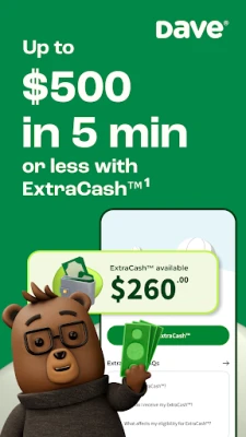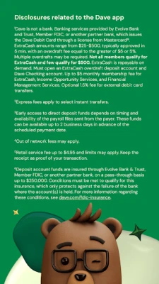 1-Dave is not a bank. Banking services provided by Evolve Bank and Trust, Member FDIC, or another partner bank, which issues the Dave Debit Card through a license from Mastercard®. ExtraCash amounts range from $25-$500, typically approved in 5 min, with an overdraft fee equal to the greater of $5 or 5%. Multiple overdrafts may be required. Not all members qualify for ExtraCash and few qualify for $500. ExtraCash is repayable on demand. Must open an ExtraCash overdraft deposit account and Dave Checking account. Up to $5 monthly membership fee for ExtraCash, Income Opportunity Services, and Financial Management Services. Optional 1.5% fee for external debit card transfers.