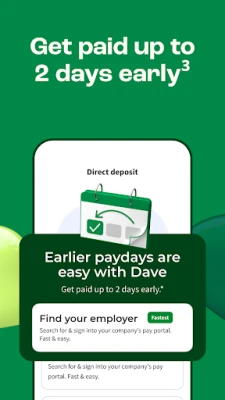 Get your paycheck up to 2 days early when you set up direct deposit.(4) A Dave Checking account streamlines your online banking experience, ensuring your money is available when you need it. A Dave Checking account makes handling money stress-free.