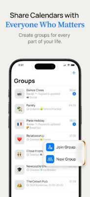 Create separate groups for family, friends, work, or clubs—each with its own members, chat, and visibility. You can share your availability across groups, while keeping your personal event details private.