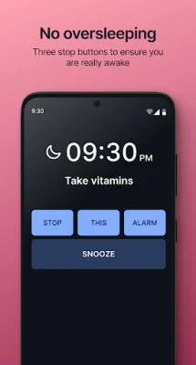 Simple Alarm has a 3-button deactivation method (optional) that prevents you from accidentally turning off the alarm and oversleeping. You will need to be really awake to press all 3 buttons.